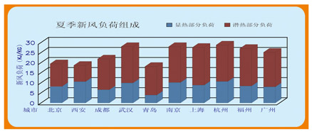 2.空調新風在夏季降溫和去濕而消耗冷量,降溫所消耗的能量(顯熱部分負荷)要遠低于去濕所消耗的能量(潛熱部分負荷),按室內溫度26℃,相對濕度70%,個地區新風能耗中的顯熱部分和潛熱部分組成為(見下圖)